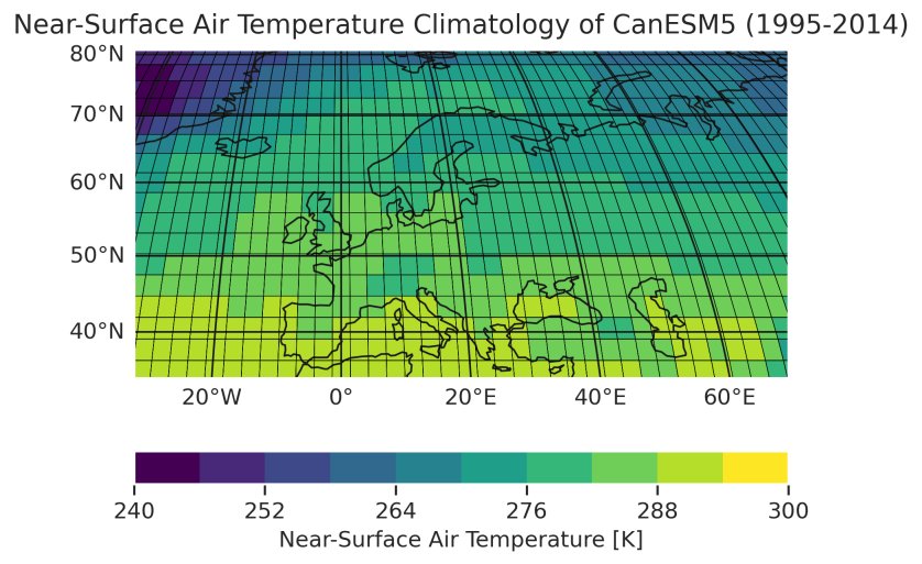Fig. 402 Historical near-surface air temperature climatology over Europe simulated by CanESM5 between 1995 and 2014. The plot visualizes the invidividual rectangular grid cells of the model’s regular grid.#