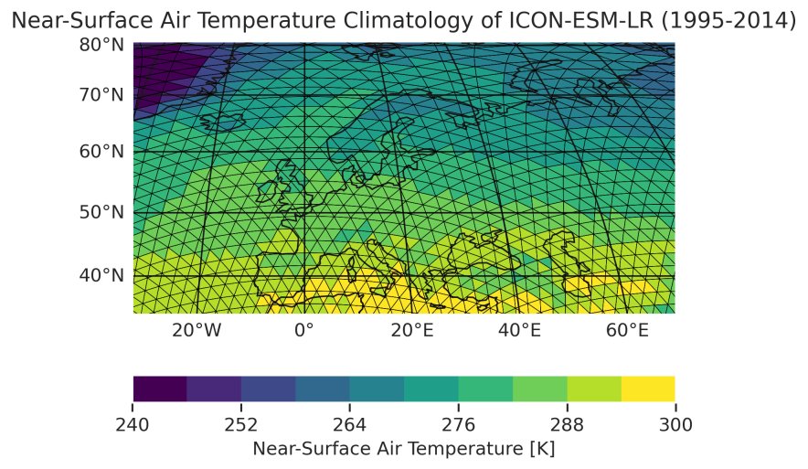 Fig. 403 Historical near-surface air temperature climatology over Europe simulated by ICON-ESM-LR between 1995 and 2014. The plot visualizes the invidividual triangular grid cells of the model’s unstructured grid.#