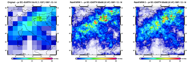 Fig. 404 Example of daily cumulated precipitation from the CMIP5 EC-EARTH model on a specific day, downscaled using RainFARM from its original resolution (1.125°) (left panel), increasing spatial resolution by a factor of 8 to 0.14°; Two stochastic realizations are shown (central and right panel). A fixed spectral slope of s=1.7 was used. Notice how the downscaled fields introduce fine scale precipitation structures, while still maintaining on average the original coarse-resolution precipitation. Different stochastic realizations are shown to demonstrate how an ensemble of realizations can be used to reproduce unresolved subgrid variability. (N.B.: this plot was not produced by ESMValTool - the recipe output is netcdf only).#