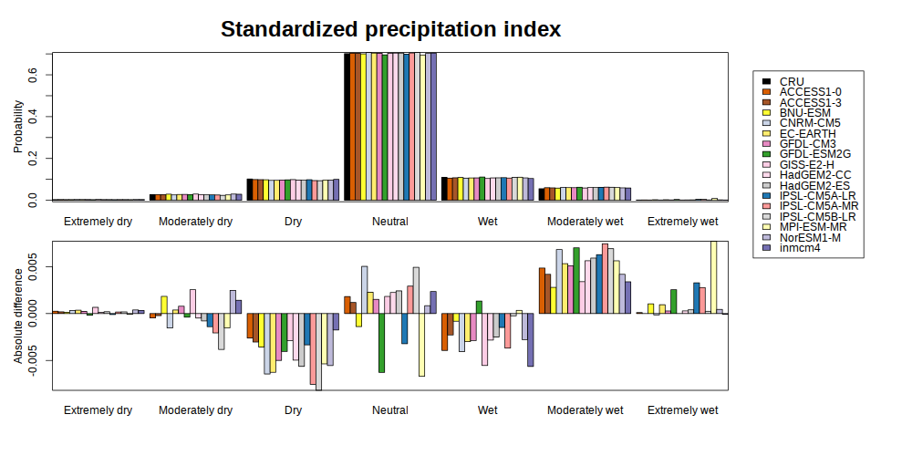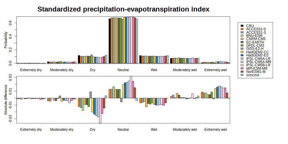 Fig. 413 (top) Probability distribution of the standardized precipitation-evapotranspiration index of a sub-set of the CMIP5 models, and (bottom) bias relative to the CRU reference data set.#