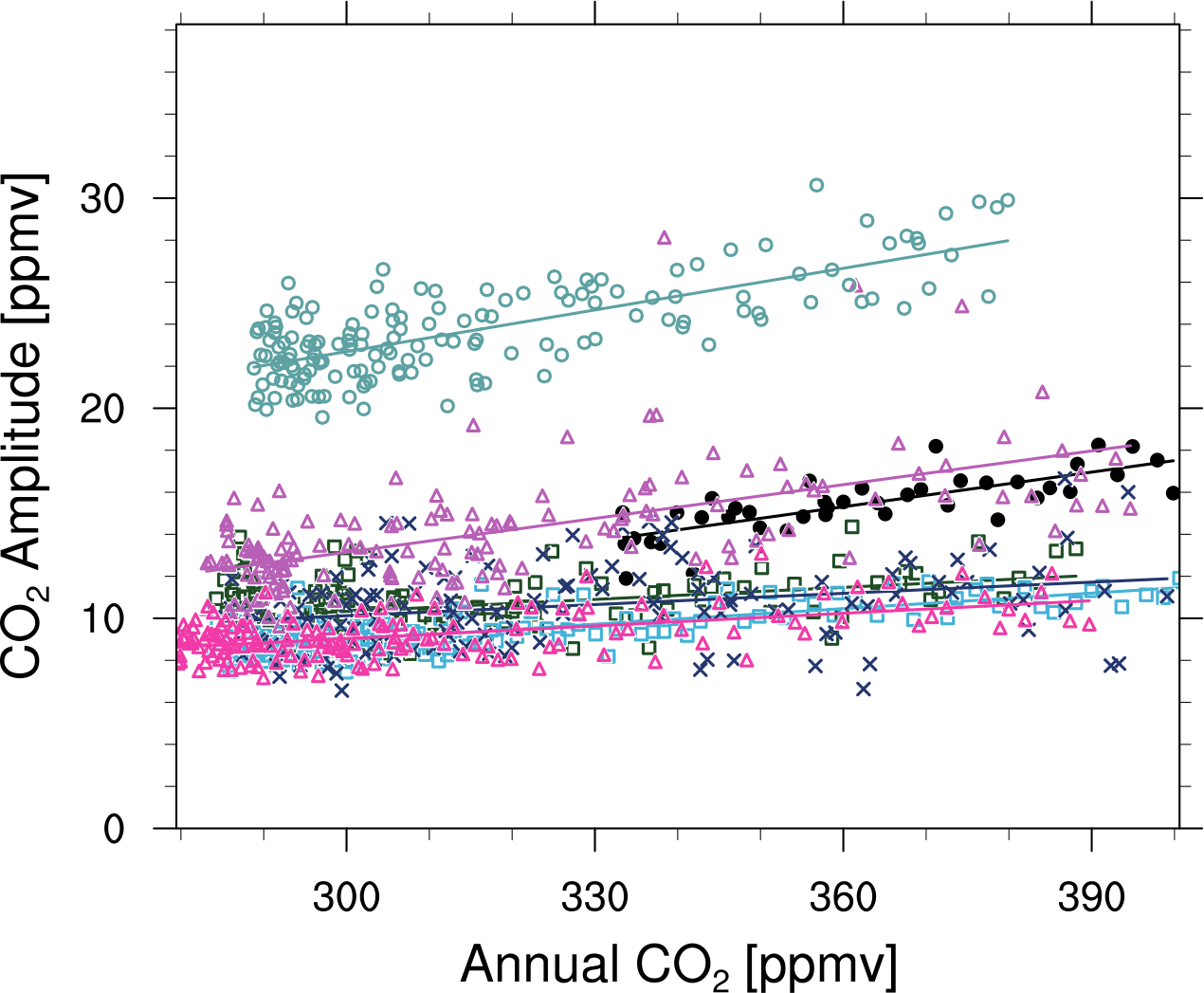 Fig. 424 Comparison of CO2 seasonal amplitudes for CMIP5 historical simulations and observations showing annual mean atmospheric CO2 versus the amplitudes of the CO2 seasonal cycle at Pt. Barrow, Alaska (produced with carbon_co2_cycle.ncl, similar to Fig. 1a from Wenzel et al. (2016)).#