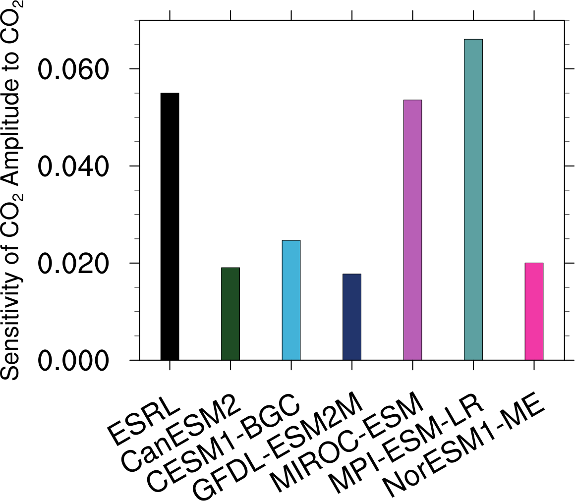 carbon_beta: (1) scatter plot of annual gpp vs. annual CO2 and (2) barchart of gpp(2xCO2)/gpp(1xCO2); calculates beta for emergent constraint (carbon_co2_cycle.ncl)