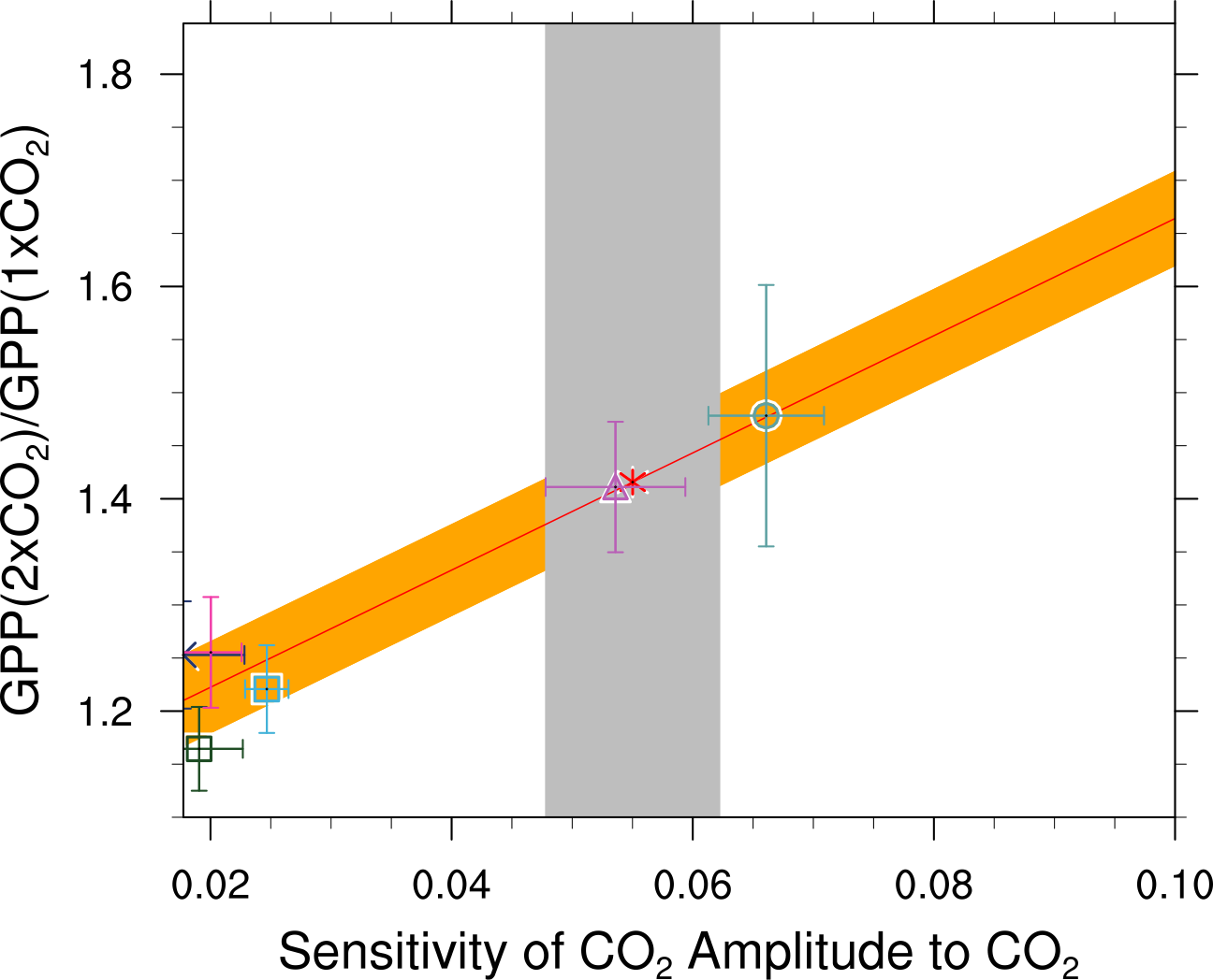 Fig. 426 Emergent constraint on the relative increase of large-scale GPP for a doubling of CO2, showing the correlations between the sensitivity of the CO2 amplitude to annual mean CO2 increases at Pt. Barrow (x-axis) and the high-latitude (60N - 90N) CO2 fertilization on GPP at 2xCO2. The red line shows the linear best fit of the regression together with the prediction error (orange shading), the gray shading shows the observed range (produced with carbon_co2_cycle.ncl, similar to Fig. 3a from Wenzel et al. (2016)).#
