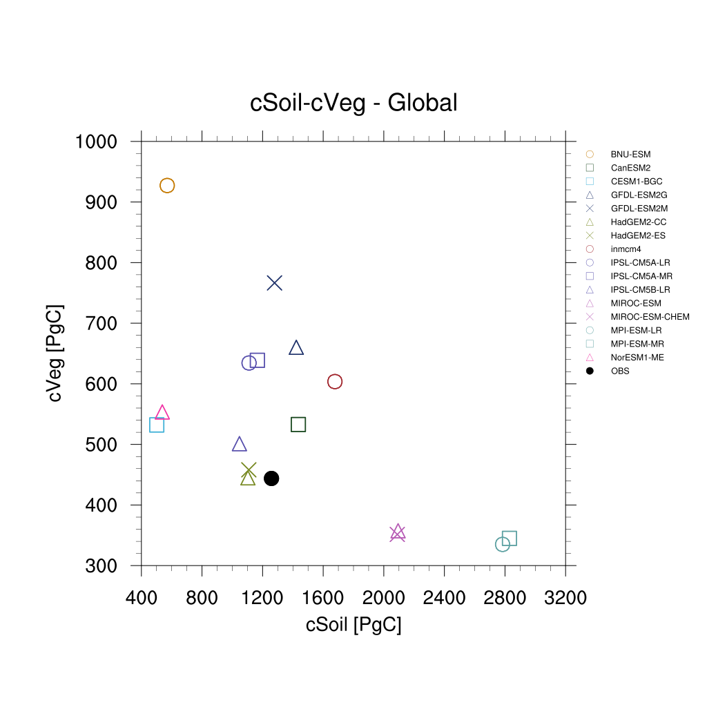 Fig. 334 Scatterplot for vegetation carbon content (cVeg) and soil carbon content (cSoil) over the period 1986-2005. Similar to Anav et al. (2013), Figure 12.#