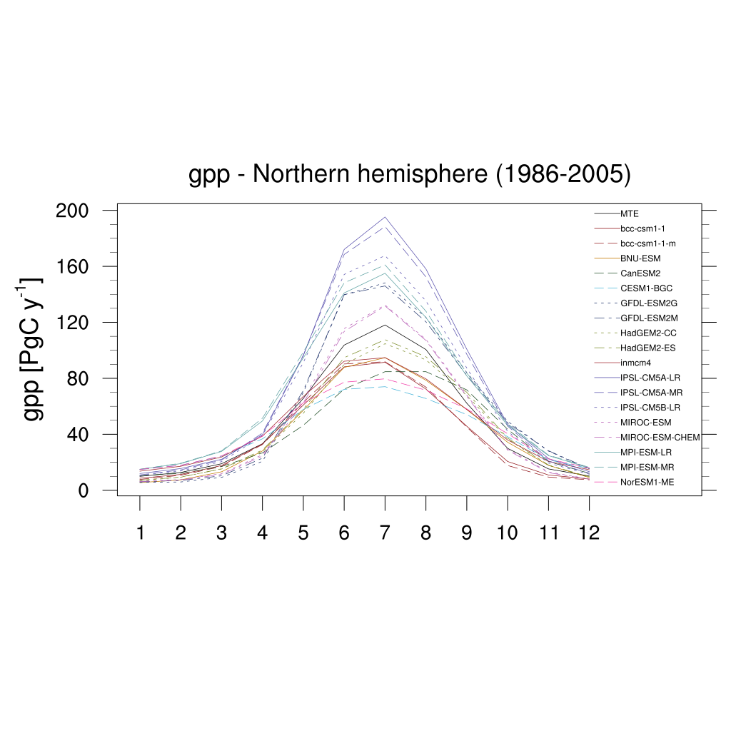 Fig. 330 Seasonal cycle plot for nothern hemisphere gross primary production (GPP) over the period 1986-2005. Similar to Anav et al. (2013), Figure 9.#