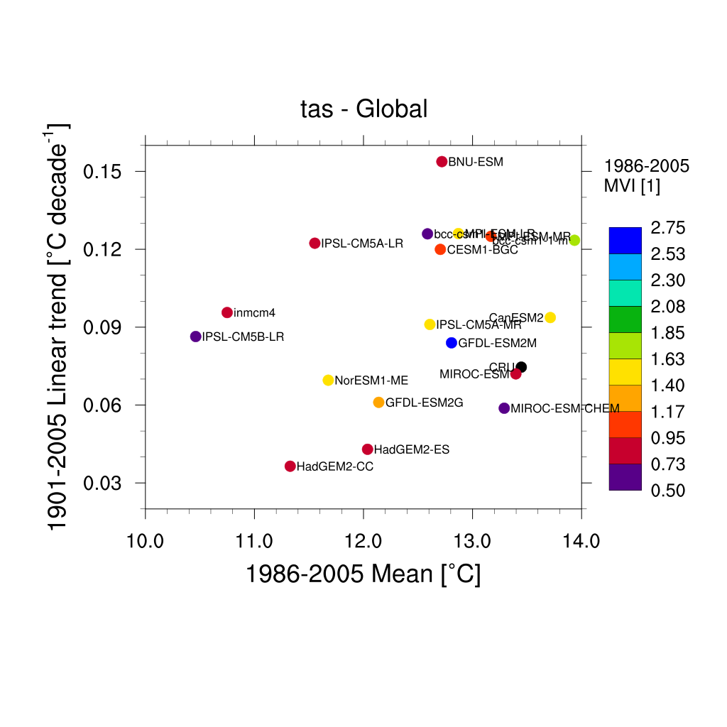 Fig. 333 Scatterplot for multiyear average of 2m surface temperature (TAS) in x axis, its linear trend in y axis, and MVI. Similar to Anav et al. (2013) Figure 1 (bottom).#