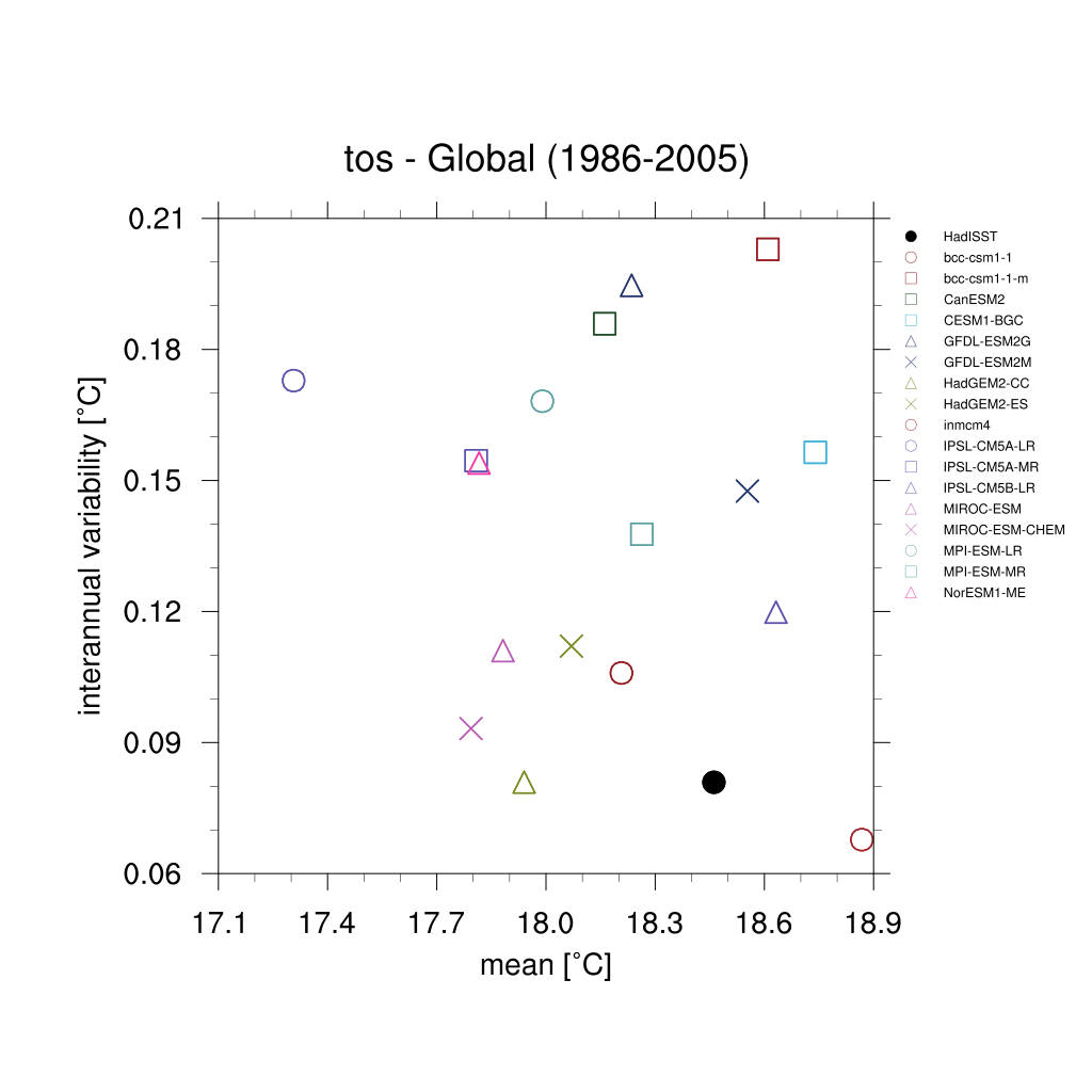 Fig. 332 Scatterplot for interannual variability and mean of global sea surface temperature (TOS) over the period 1986-2005.#