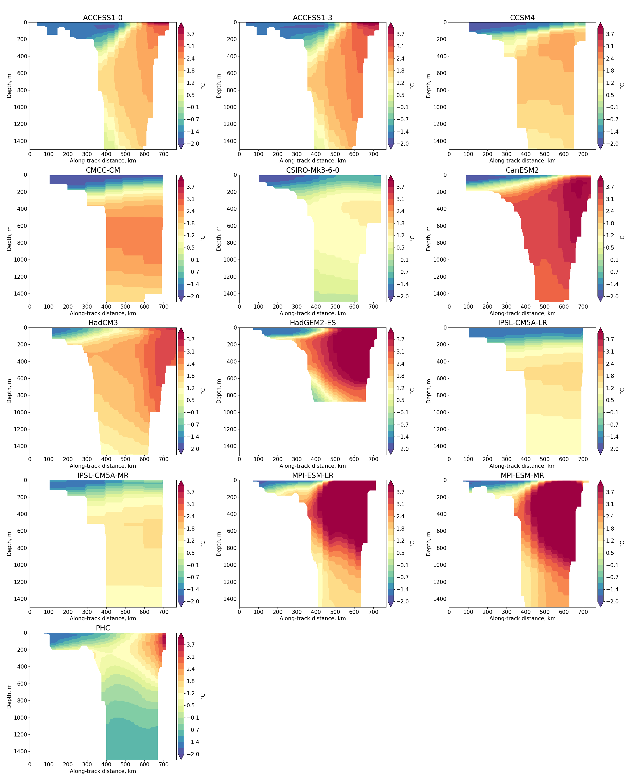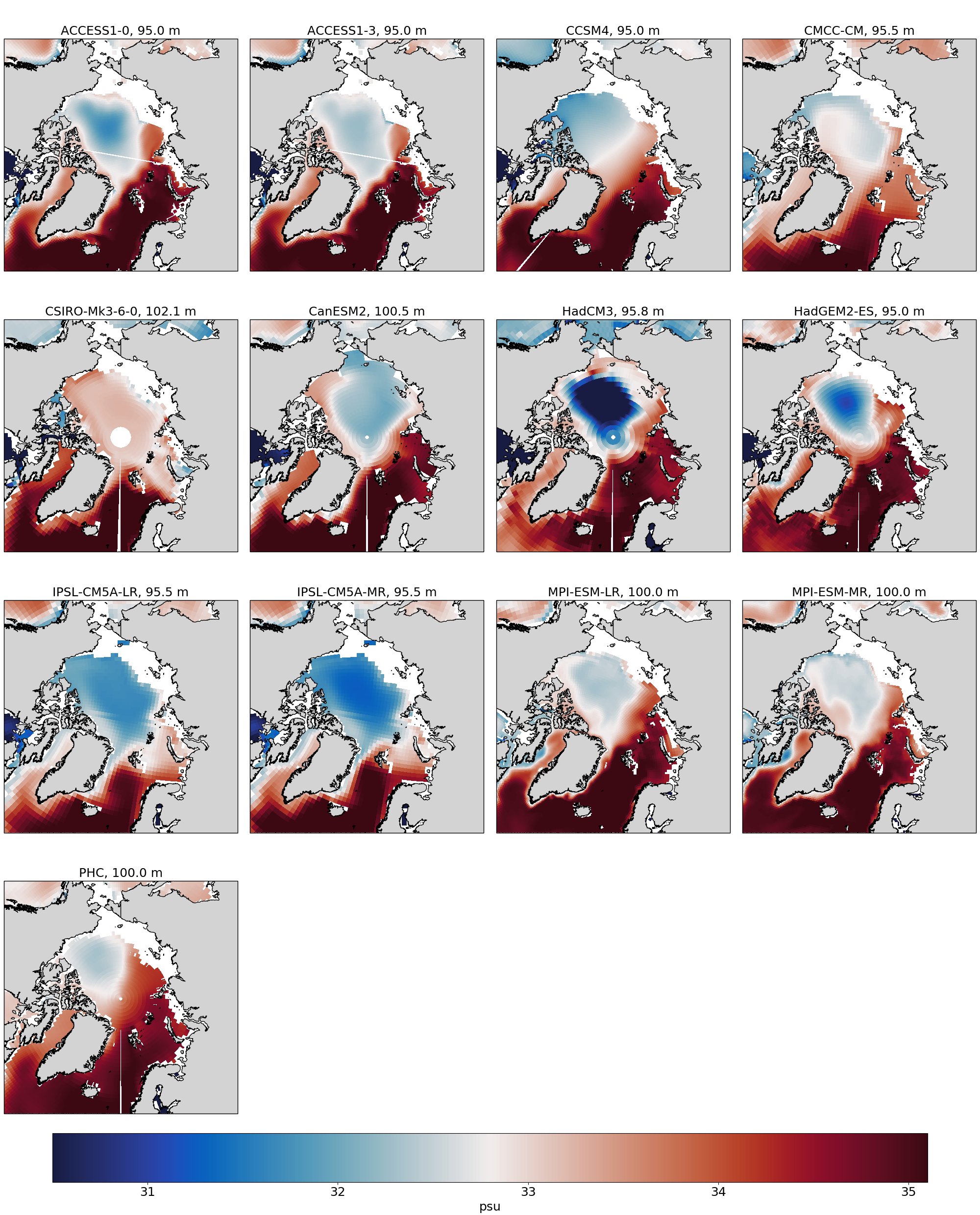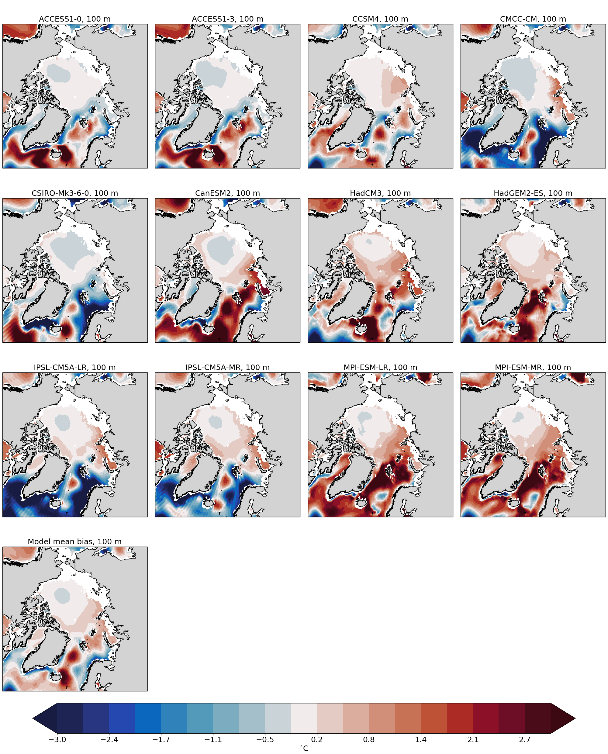 In order to evaluate the spatial distribution of Atlantic water in different climate models we also provide diagnostics with maps of the spatial temperature distribution at model’s Atlantic Water depth.