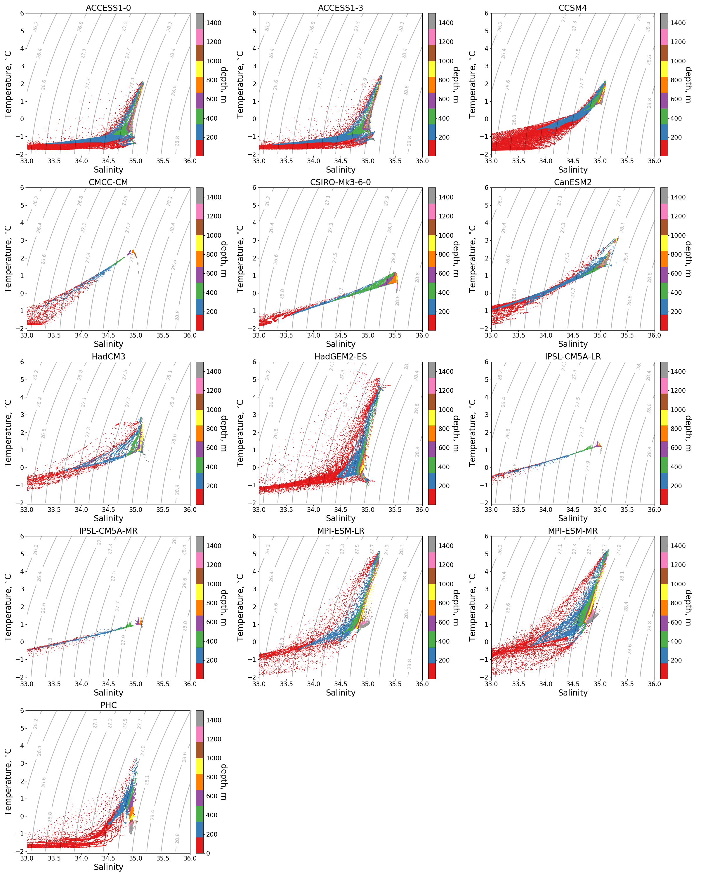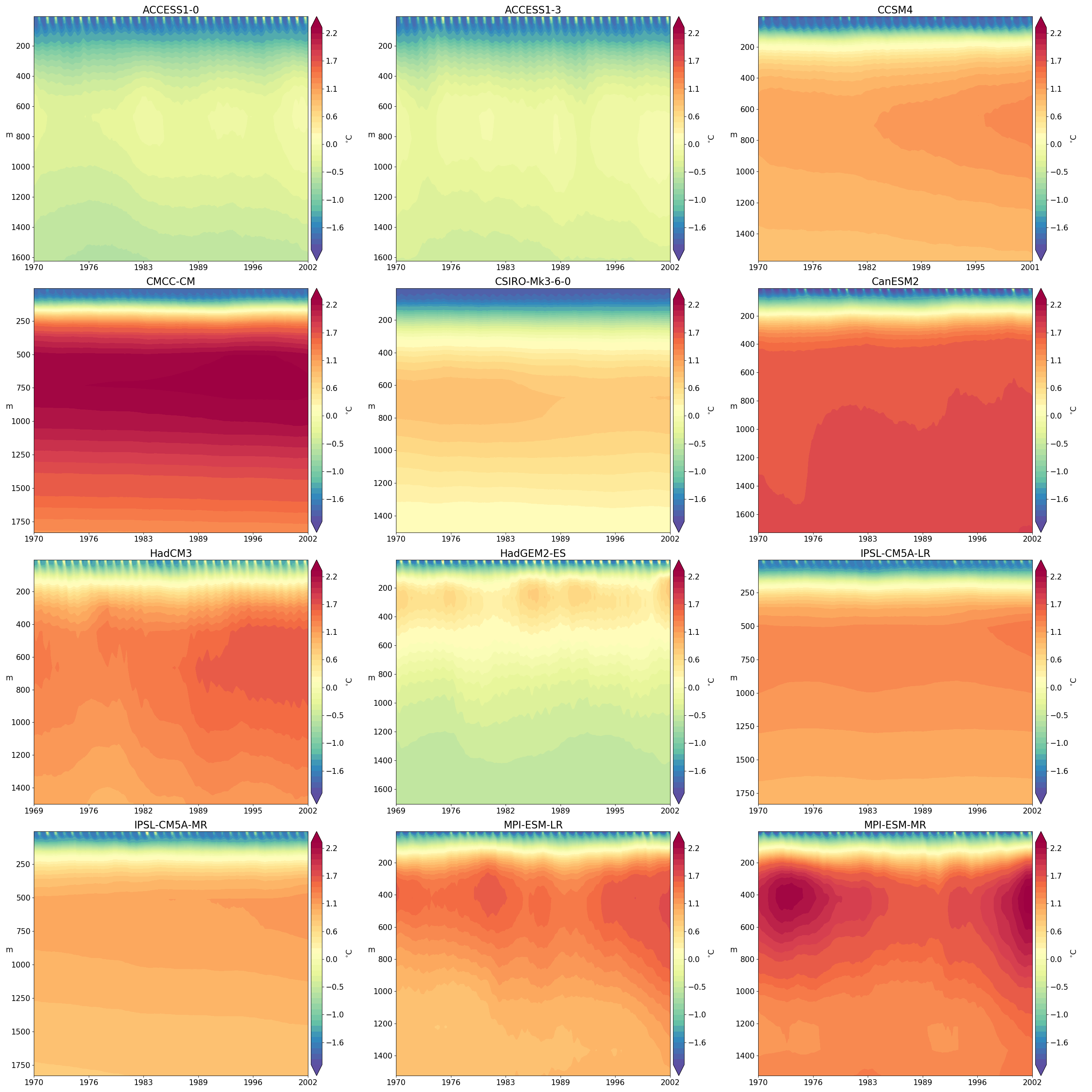 Fig. 342 Hovmoller diagram of monthly spatially averaged potential temperature in the Eurasian Basin of the Arctic Ocean for selected CMIP5 climate models (1970-2005).#