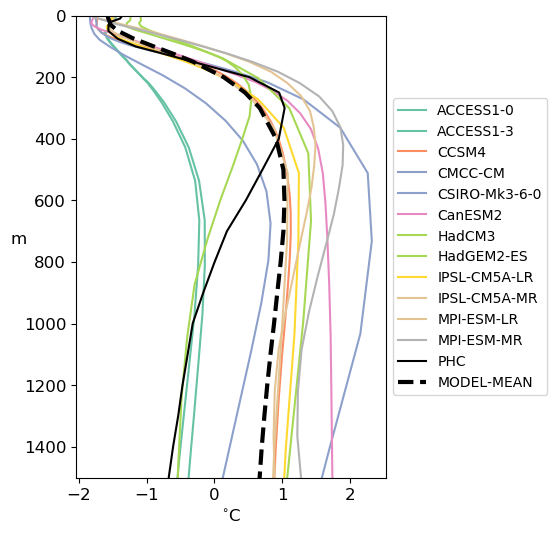 Fig. 343 Mean (1970-2005) vertical potential temperature distribution in the Eurasian basin for participating CMIP5 coupled ocean models, PHC3 climatology (dotted red line) and multi-model mean (dotted black line).#