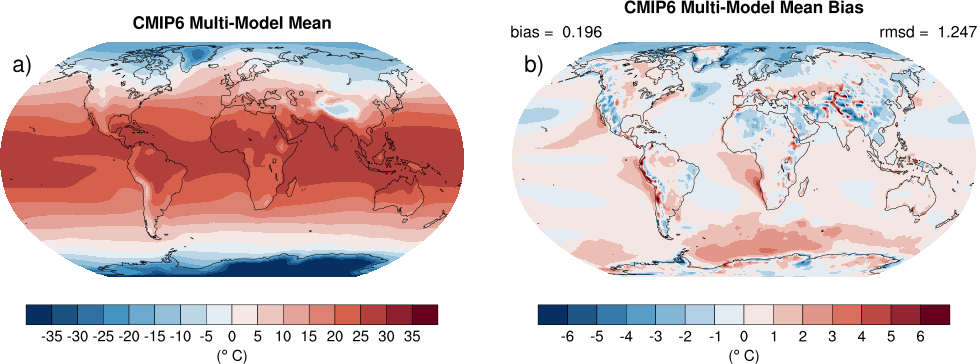 Fig. 190 Annual mean near‐surface (2 m) air temperature (°C). (a) Multimodel (ensemble) mean constructed with one realization of CMIP6 historical experiments for the period 1995-2014. Multimodel‐mean bias of (b) CMIP6 (1995-2014) compared to the corresponding time period of the climatology from ERA5 (Copernicus Climate Change Service (C3S), 2017). (Fig. 3)#