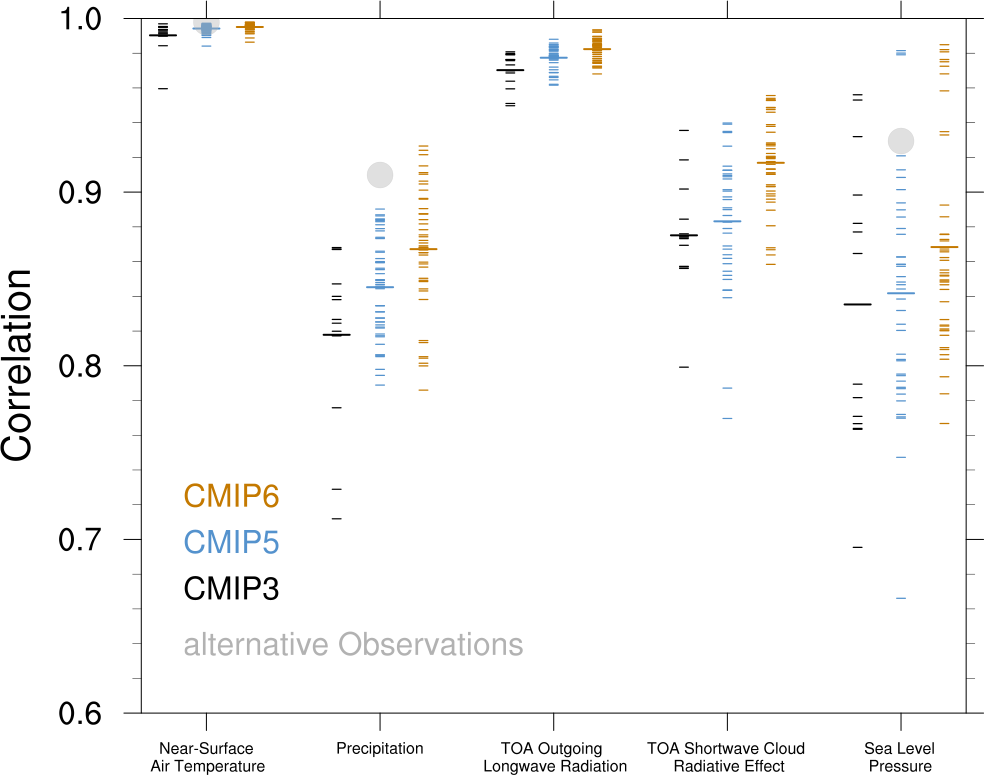 Fig. 192 Centered pattern correlations between models and observations for the annual mean climatology over the period 1980–1999 (Fig. 7).#