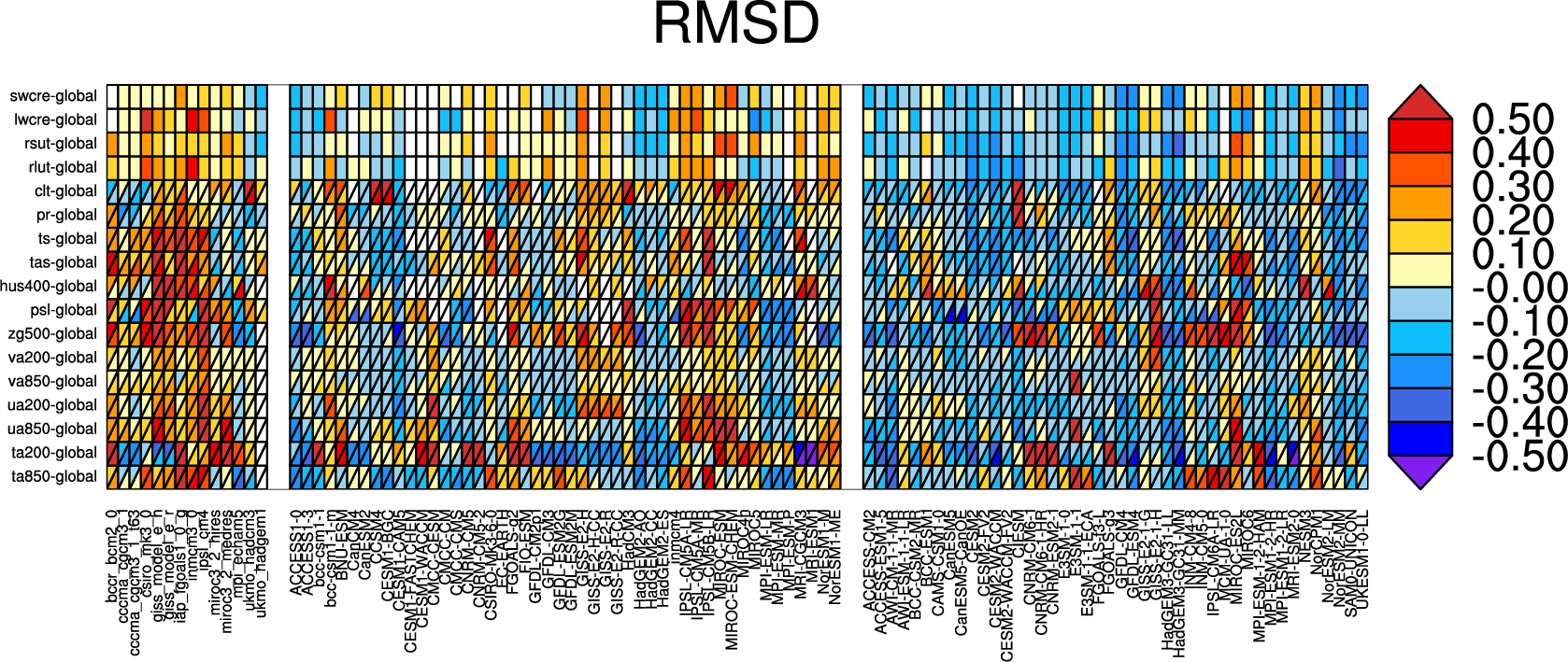 Fig. 191 Relative space-time root-mean-square deviation (RMSD) calculated from the climatological seasonal cycle of the CMIP3, CMIP5, and CMIP6 simulations (1980-1999) compared to observational data sets (Table 5). A relative performance is displayed, with blue shading being better and red shading worse than the median RMSD of all model results of all ensembles. A diagonal split of a grid square shows the relative error with respect to the reference data set (lower right triangle) and the alternative data set (upper left triangle) which are marked in Table 5. White boxes are used when data are not available for a given model and variable (Fig. 6).#