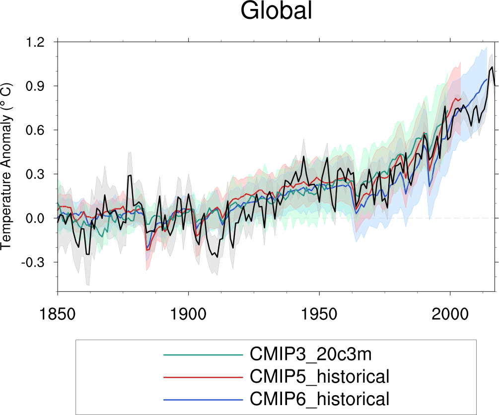 Fig. 188 Observed and simulated time series of the anomalies in annual and global mean surface temperature. All anomalies are differences from the 1850-1900 time mean of each individual time series (Fig. 1).#