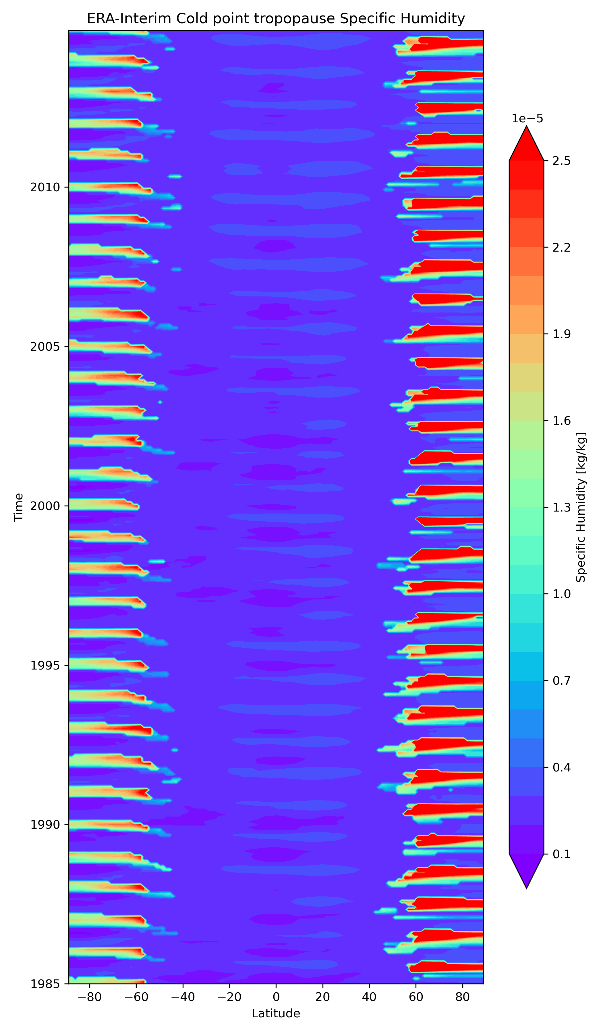 Fig. 149 Latitude versus time plot of the Specific Humidity (hus) at the cold point tropopause from ERA-Interim data.#