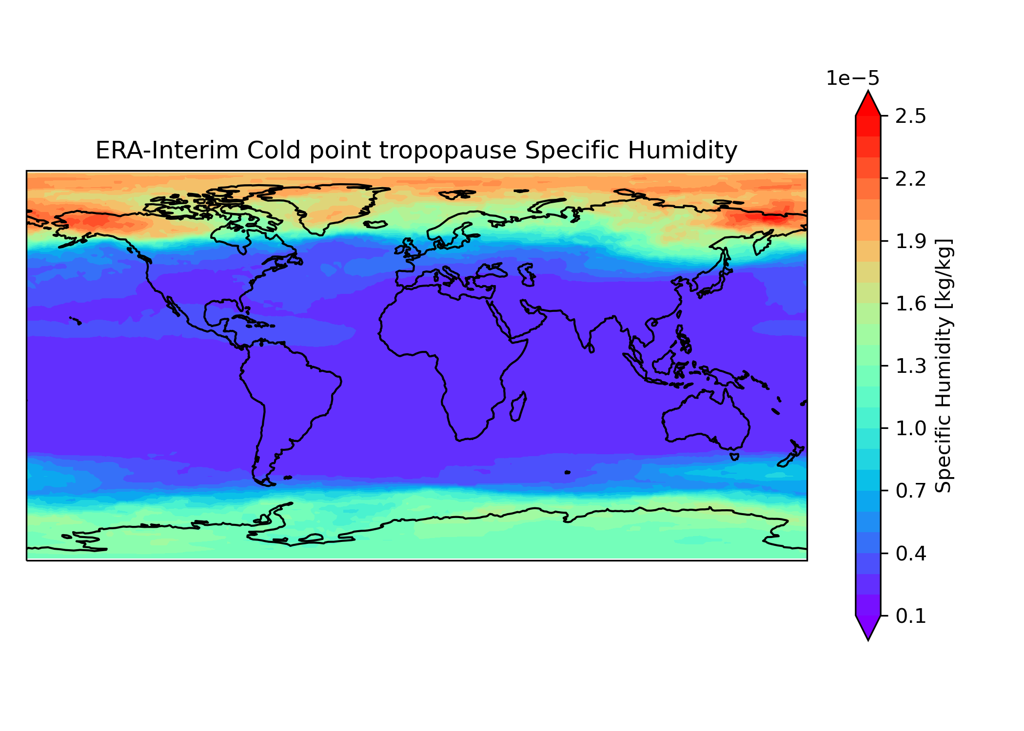 Fig. 148 Map of the average Specific Humidity (hus) at the cold point tropopause from ERA-Interim data. The diagnostic averages the complete time series, here 2010-2014.#
