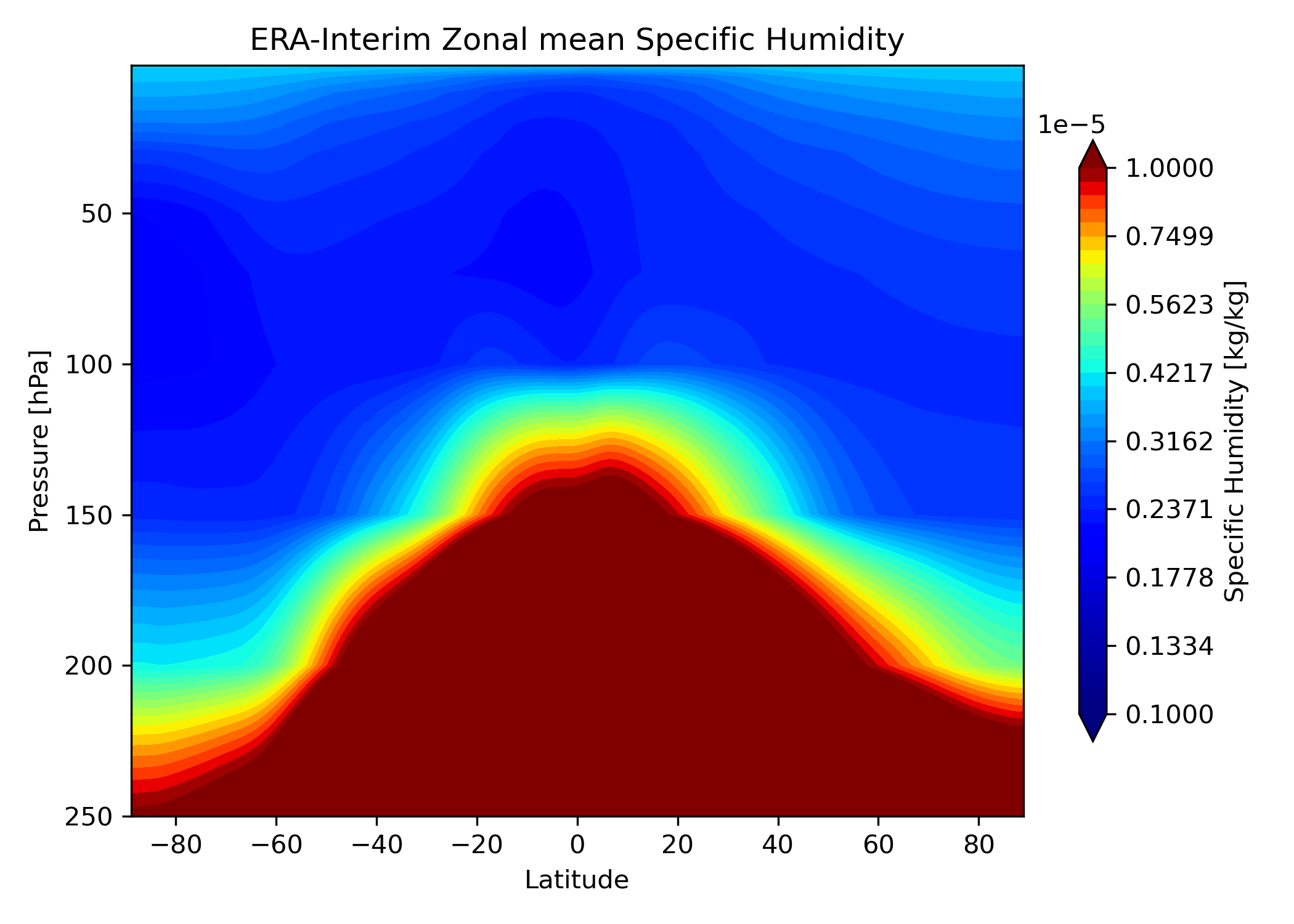 Fig. 150 Zonal average Specific Humidity (hus) between 250 and 1 hPa from ERA-Interim data. The diagnostic averages the complete time series, here 1985-2014.#