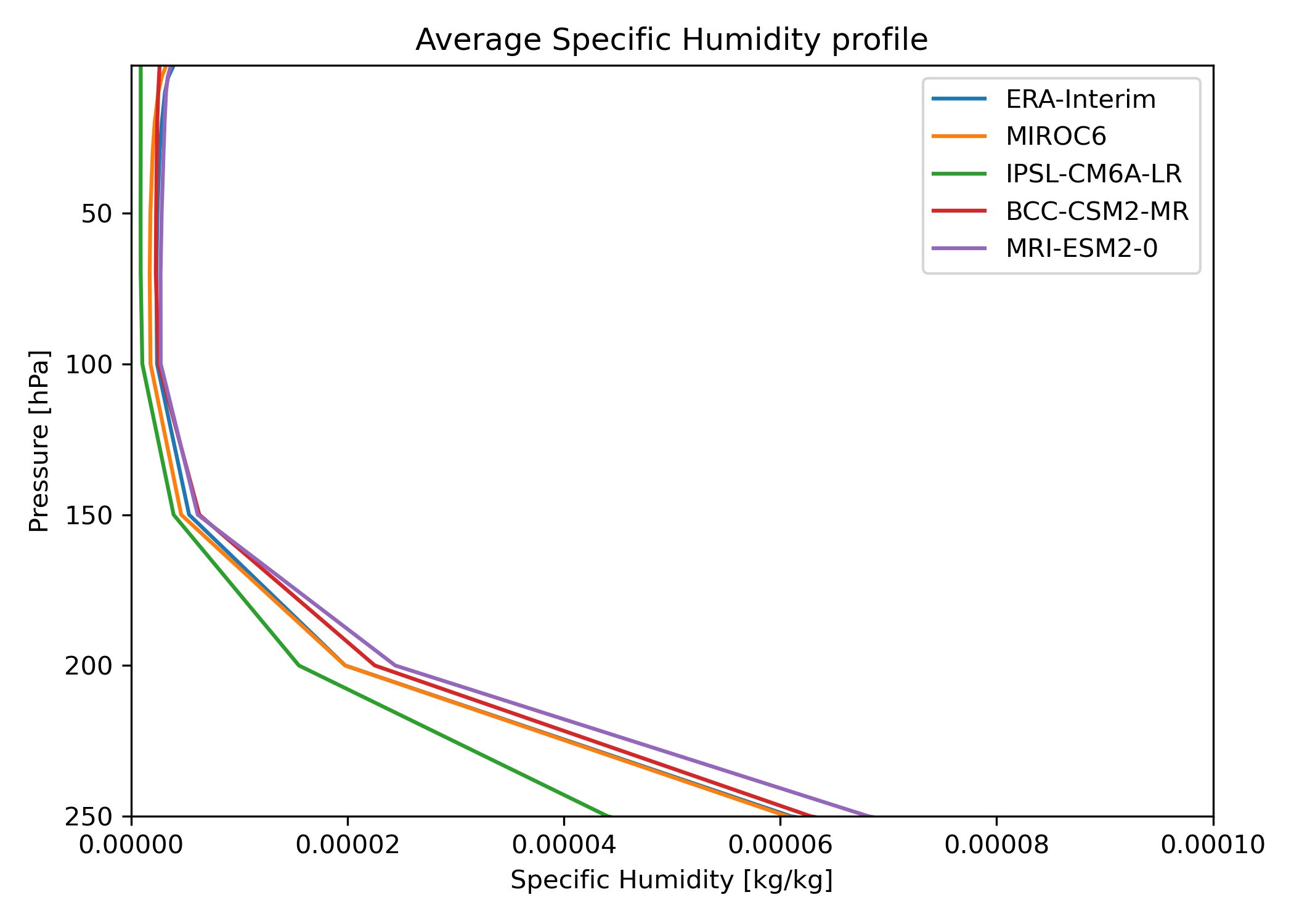 Fig. 151 Average Specific Humidity (hus) profile between 250 and 1 hPa from ERA-Interim and CMIP6 model data. The diagnostic averages the complete time series, here 1985-2014.#