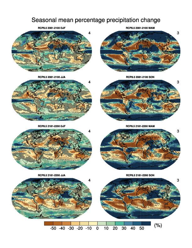 Fig. 313 Multi-model CMIP5 average percentage change in seasonal mean precipitation relative to the reference period 1986–2005 averaged over the periods 2081–2100 and 2181–2200 under the RCP8.5 forcing scenario. Hatching indicates regions where the multi-model mean change is less than one standard deviation of internal variability. Stippling indicates regions where the multi-model mean change is greater than two standard deviations of internal variability and where at least 90% of models agree on the sign of change#