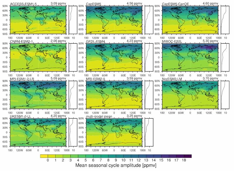 Fig. 170 Panel plot of spatially resolved seasonal cycle amplitude for all models, including a zonal average sidepanel.#
