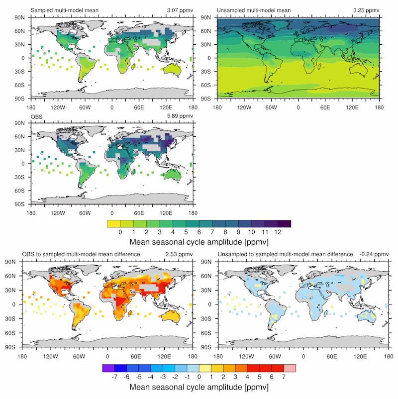 Fig. 171 Seasonal cycle amplitude map comparing influence of sampling, and difference to observations.#