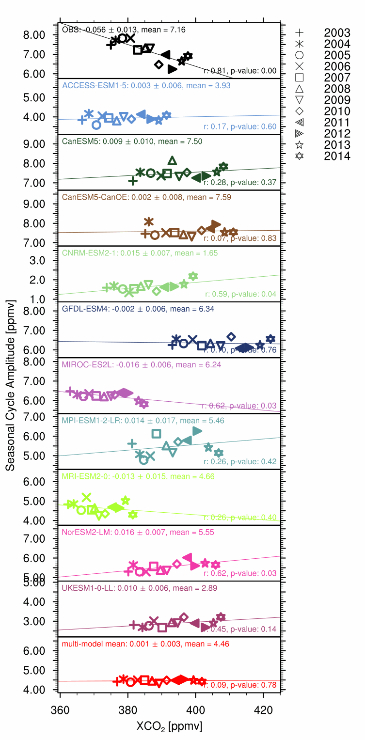 Fig. 172 Panel plots showing seasonal cycle amplitude against XCO2, includes regression line and p-value.#