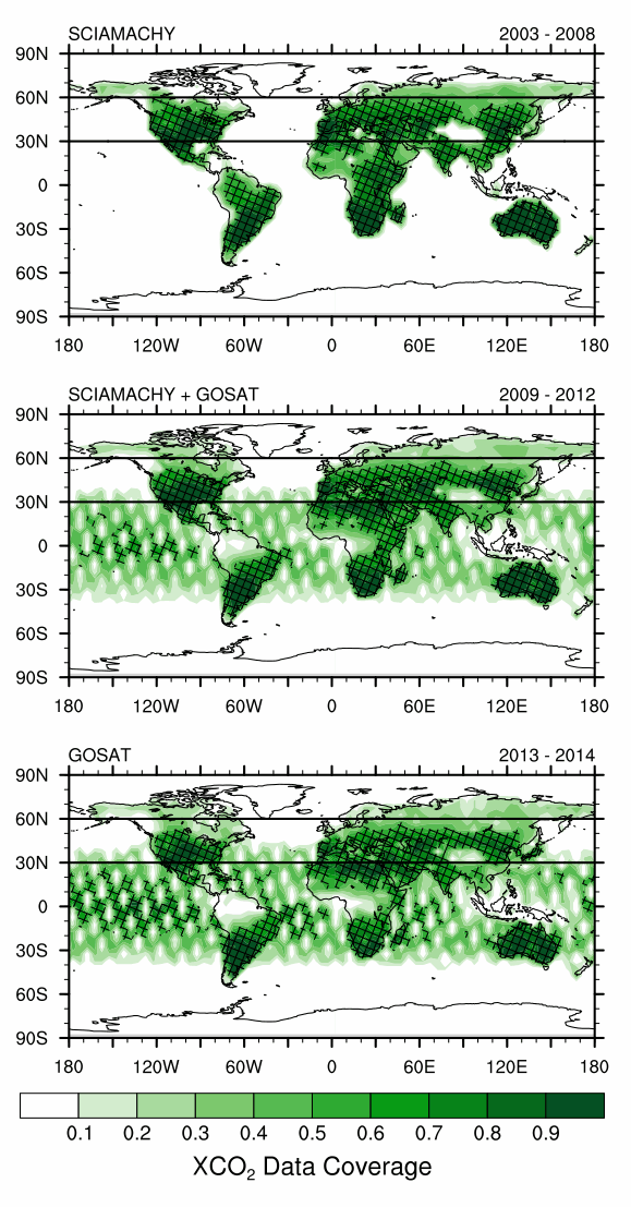 This recipe reproduces the figures of Gier et al. (2020). It uses satellite column-averaged CO2 data to evaluate ESMs by plotting several quantities such as timeseries, seasonal cycle and growth rate in different areas.