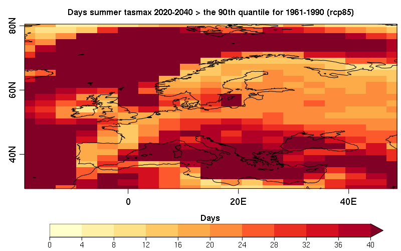 The diagnostic calculates the number of days in which the temperature exceeds or does not exceeds the necessary threshold for a consecutive number of days in future climate projections. The result is an annual time series of the total number of heat/cold wave days for the selected season at each grid point. The final output is the average number of heat/cold wave days for the selected season in the future climate projections.