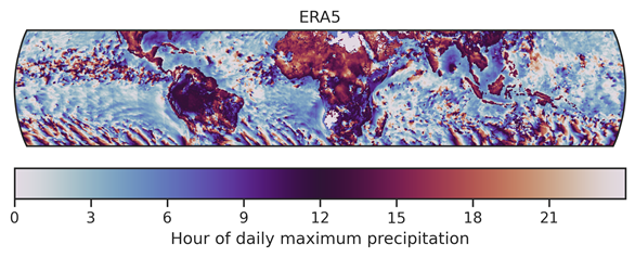 Fig. 106 Hour of maximum precipitation from ERA5 in the tropics (30°S-30°N) for the months June, July, August 2000.#