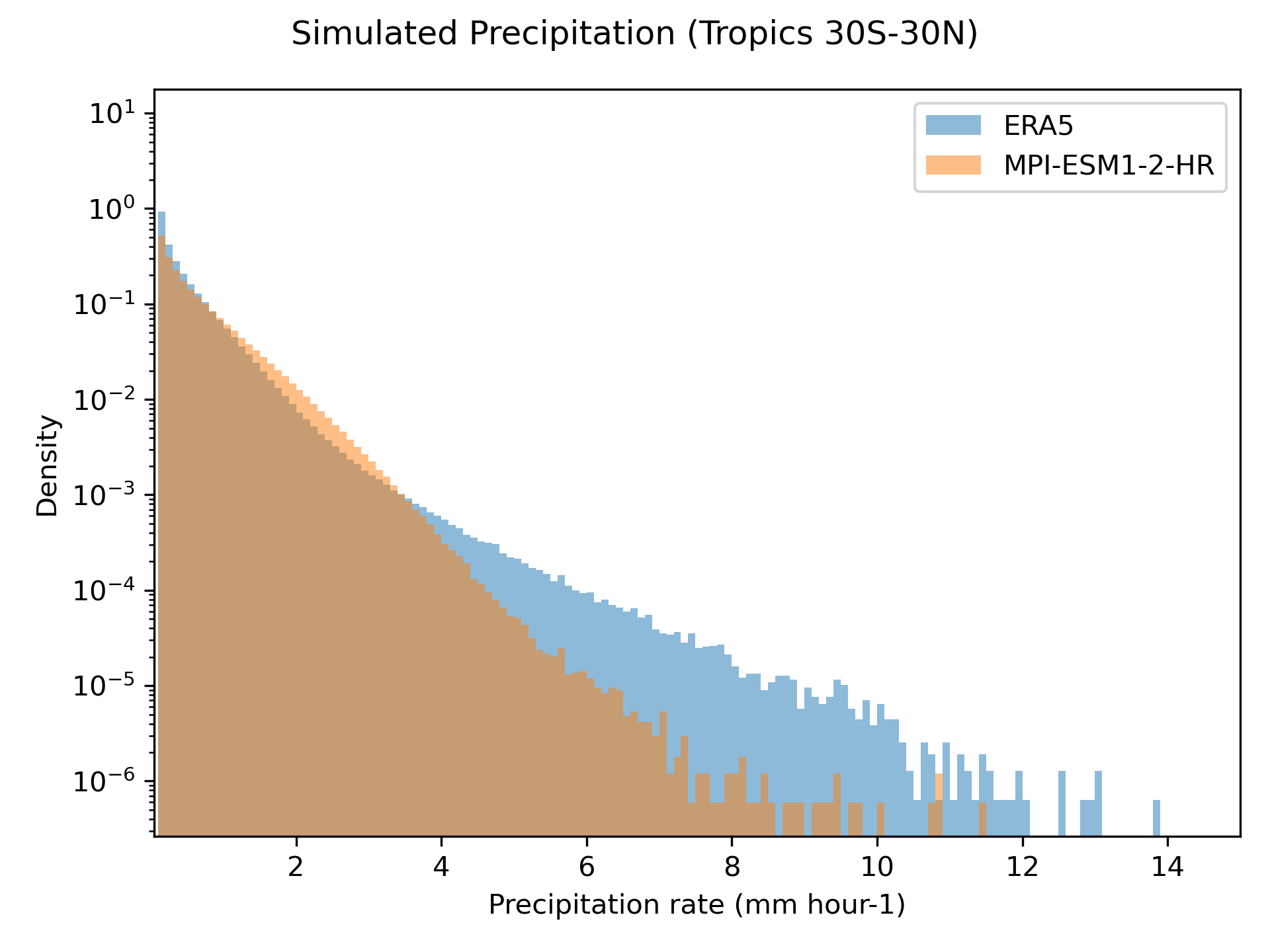 Fig. 105 Histogram of precipitation rates from MPI-ESM1-2-HR and ERA5 reanalysis 3-hourly data over the Tropics (30°S-30°N) for the years 1979-1980.#