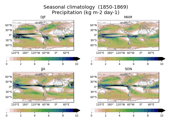 Fig. 108 Seasonal climatology of pr, with a custom colorbar.#