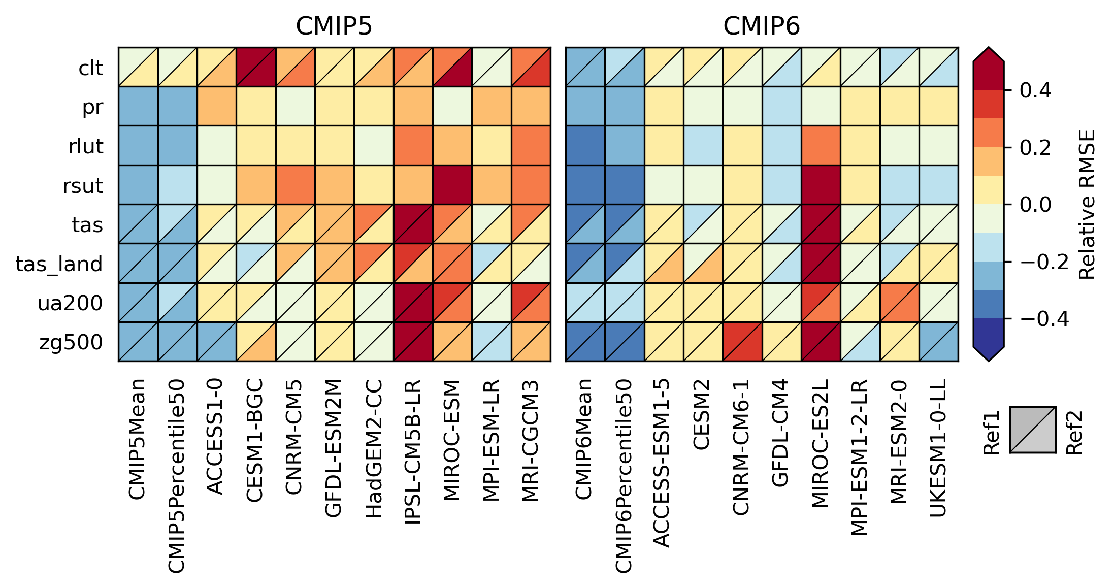 Fig. 122 Relative space-time root-mean-square deviation (RMSD) calculated from the climatological seasonal cycle of CMIP5 and CMIP6 simulations. A relative performance is displayed, with blue shading indicating better and red shading indicating worse performance than the median of all model results. A diagonal split of a grid square shows the relative error with respect to the reference data set.#