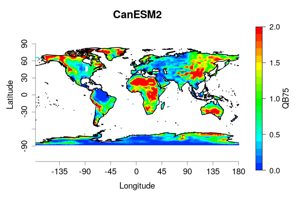 Fig. 187 Quantile bias, as defined in Mehran et al. 2014, with threshold t=75th percentile, evaluated for the CanESM2 model over the 1979-2005 period, adopting GPCP-SG v 2.3 gridded precipitation as a reference dataset. The optimal reference value is 1. Both datasets have been regridded onto a 2° regular grid.#