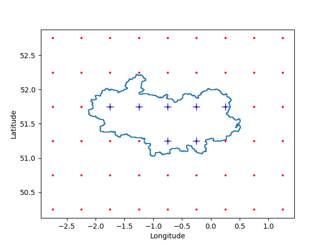 Fig. 398 Example of the selection of model grid points falling within (blue pluses) and without (red dots) a provided shapefile (blue contour).#