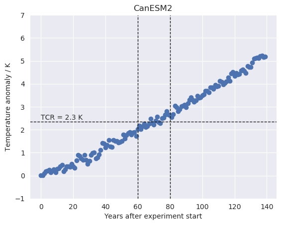 Fig. 261 Time series of the global mean surface air temperature anomaly (relative to the linear fit of the pre-industrial control run) of CanESM2 (CMIP5) for the 1% CO2 increase per year experiment. The horizontal dashed line indicates the transient climate response (TCR) defined as the 20 year average temperature anomaly centered at the time of CO2 doubling (vertical dashed lines).#